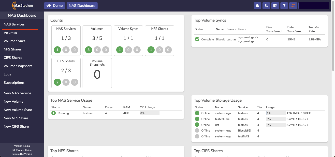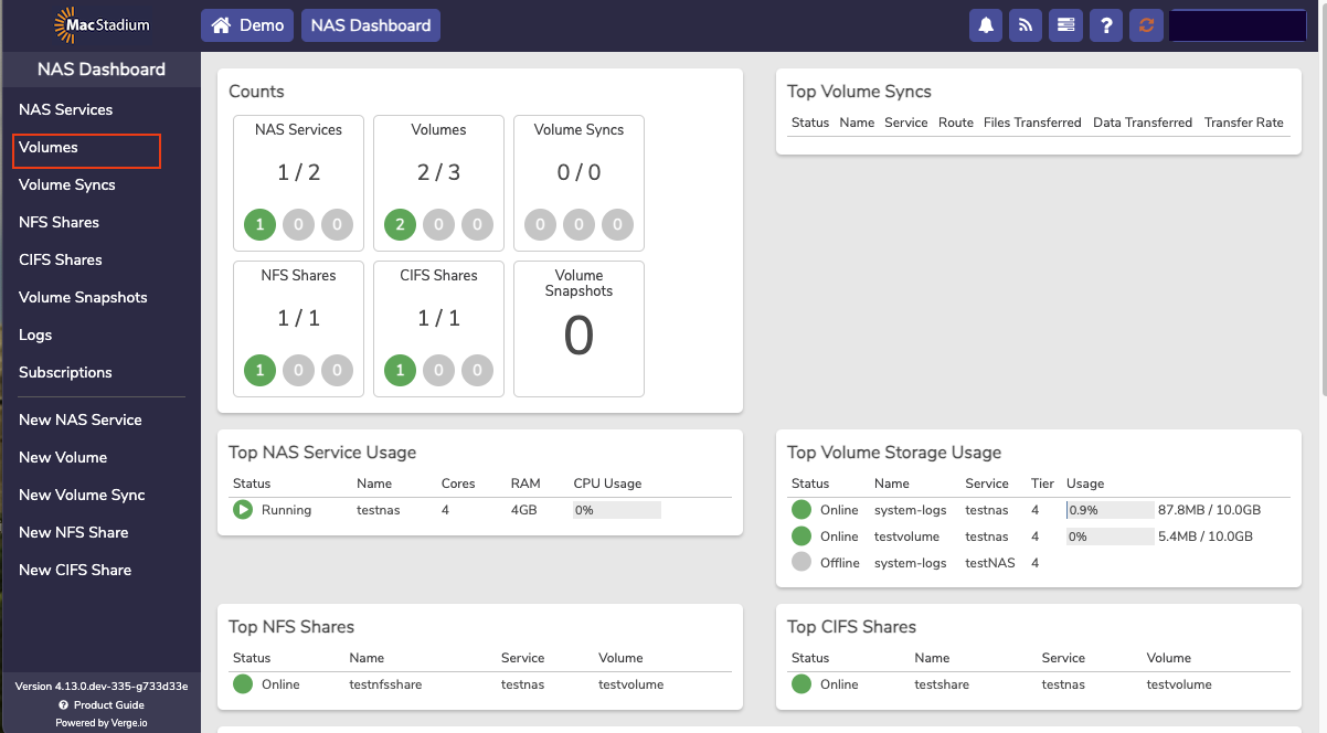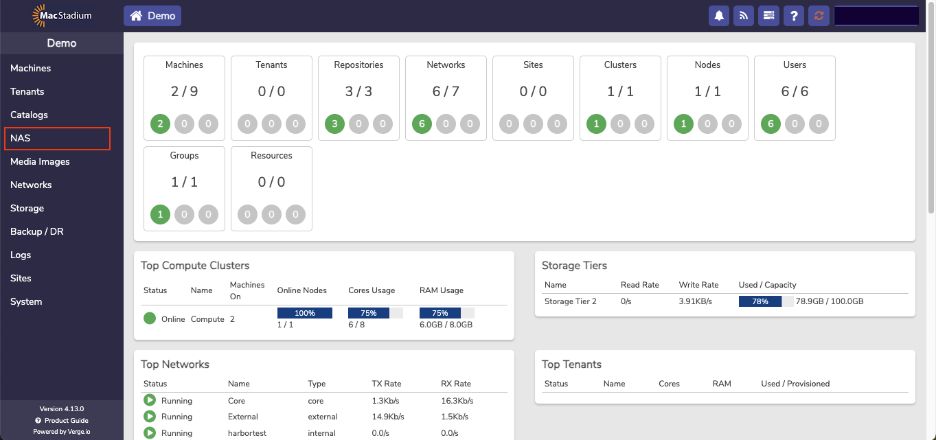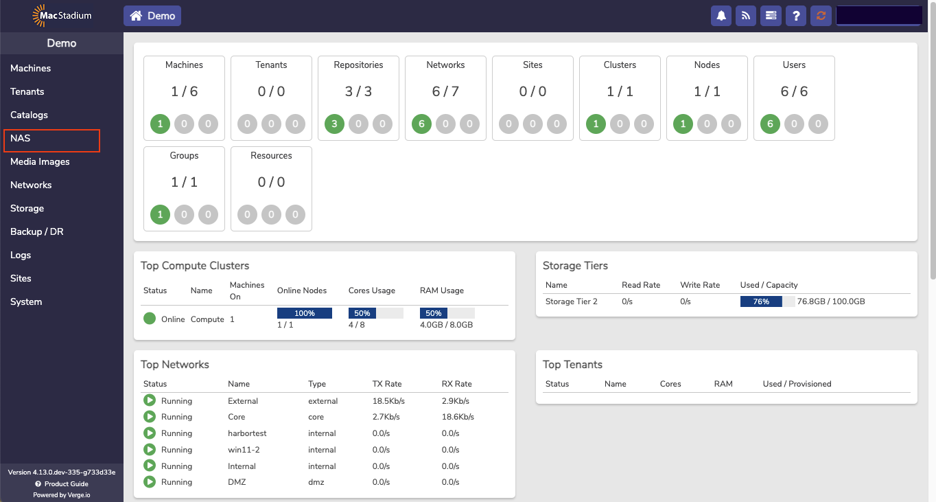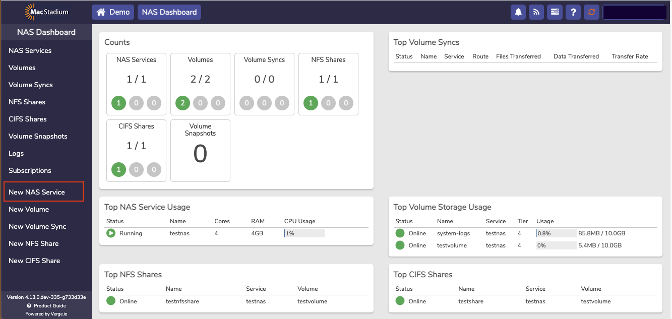 The NAS service is a dedicated virtual machine that presents itself as a service providing users the ability the create and manage file based storage without the need for using physical or virtual appliances. Each NAS service includes its own dashboard and is fully managed from the user interface. Using the integrated NAS service takes advantage of the VergeIO snapshot engine and deduplication algorithm to get the most of usable storage space.- From the Cloud Dashboard, select NAS from the left menu.