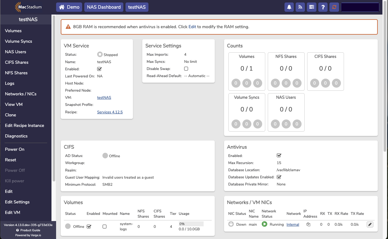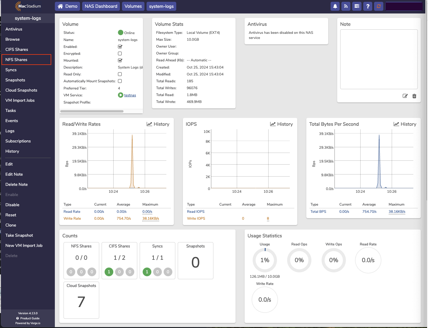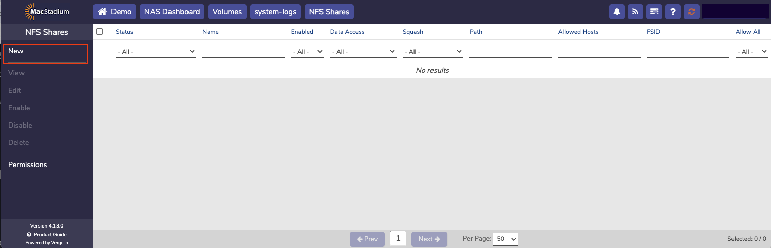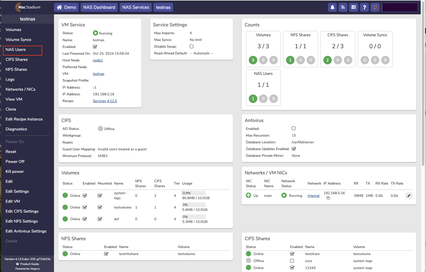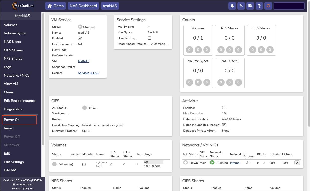 The NAS service is a dedicated virtual machine that presents itself as a service providing users the ability the create and manage file based storage without the need for using physical or virtual appliances. Each NAS service includes its own dashboard and is fully managed from the user interface. Using the integrated NAS service takes advantage of the VergeIO snapshot engine and deduplication algorithm to get the most of usable storage space.- From the Cloud Dashboard, select NAS from the left menu.