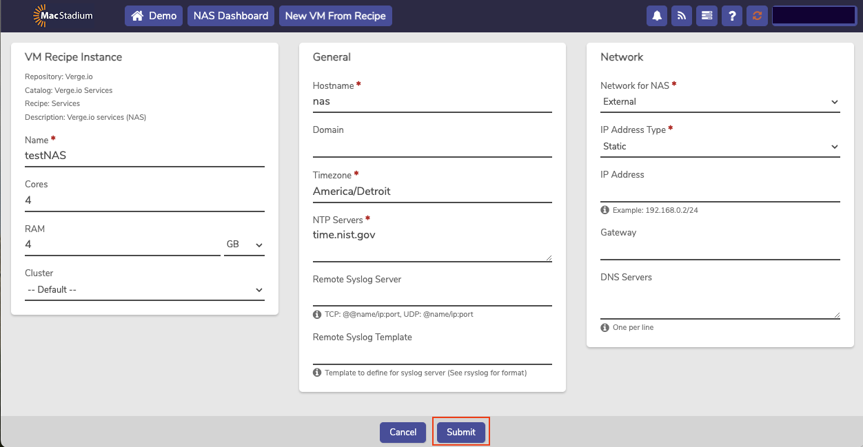 - Define a Hostname for the NAS Service VM.