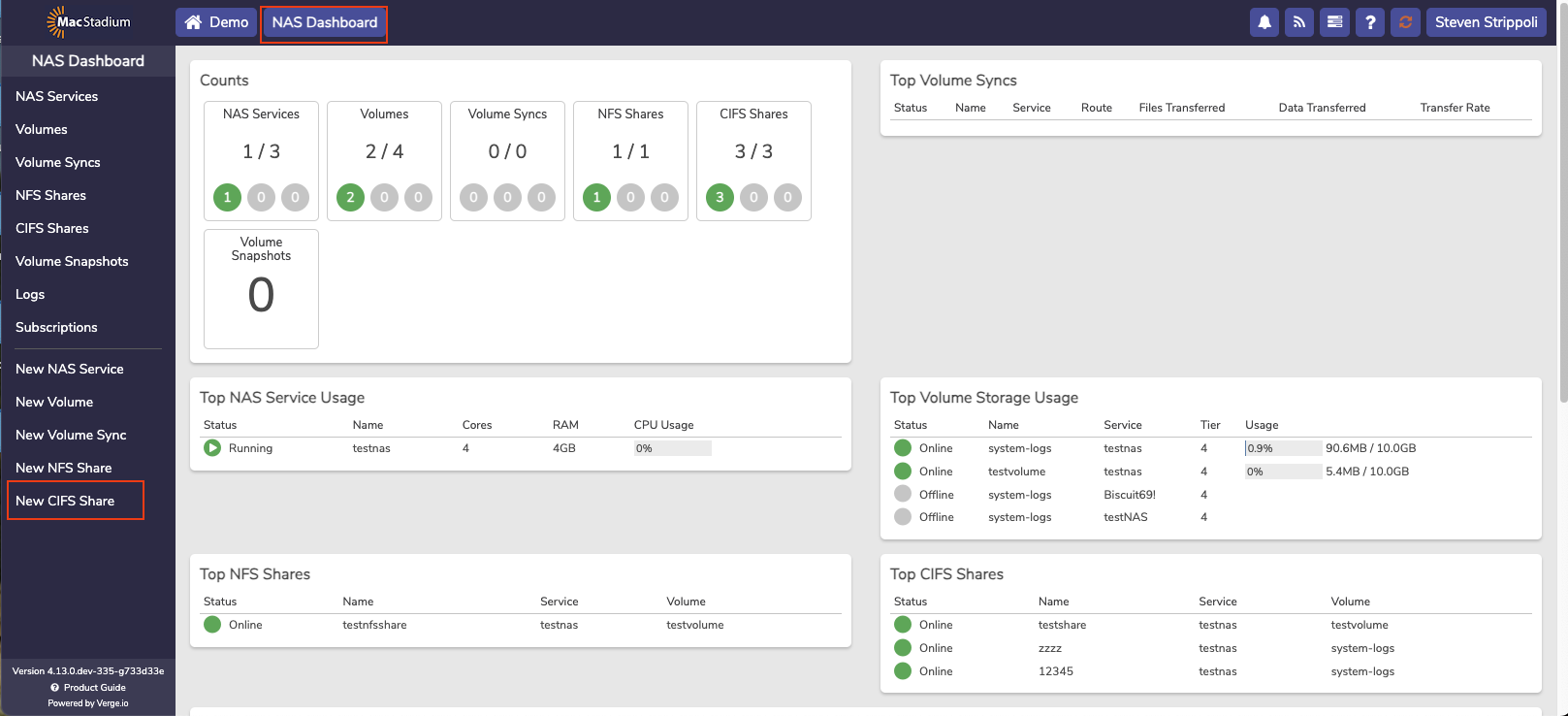CIFS (Common Internet File System) is a network protocol that allows clients to communicate with servers and access file sharing and print services as if they were stored locally. CIFS offers robust security features, which make them suitable for secure environments. They are important in Private Cloud because they allow access to a NAS volume over CIFS/SMB.- Navigate to the NAS Dashboard.