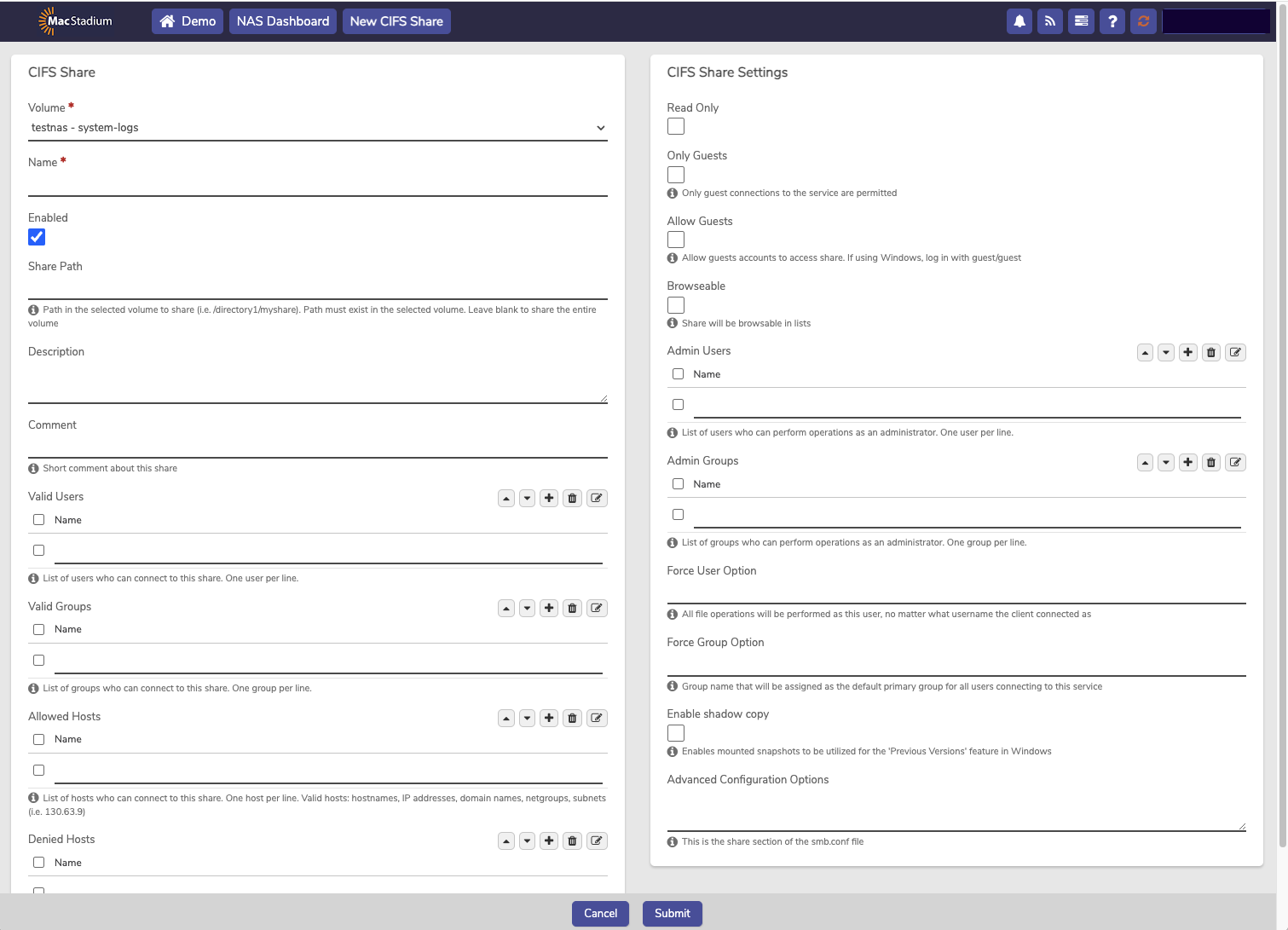 - In the CIFS Shares screen enter the necessary information.