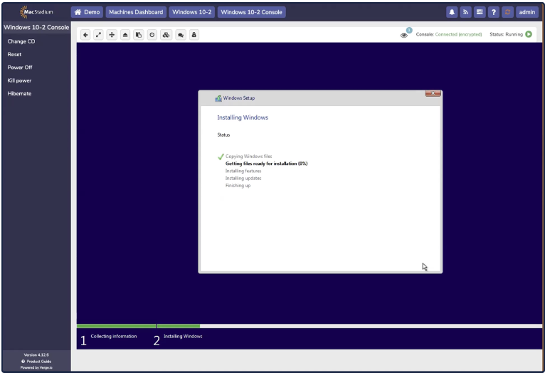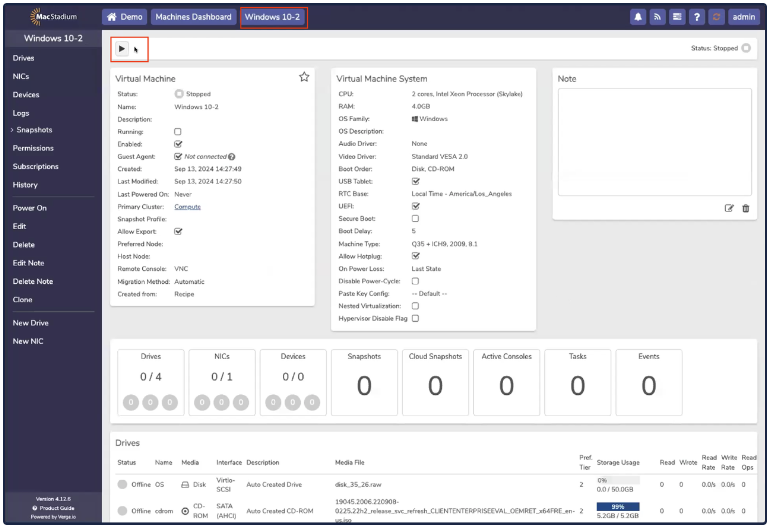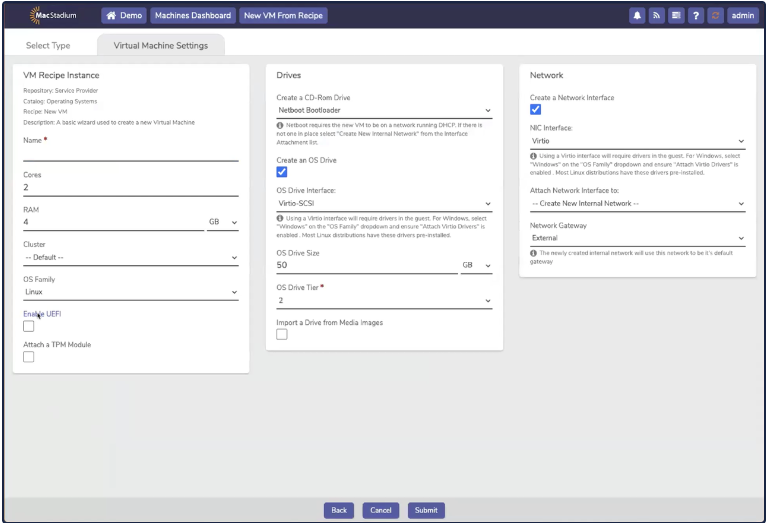 Windows does not include Virtio drivers by default. These drivers need to be installed from a mounted disk during Windows installation.For Windows Server installation, MacStadium highly recommends the use of the Windows Server recipe.1. Windows requires additional drivers in order to access Private Cloud’s virtualized storage and network hardware. To install a Windows VM manually, select Machines Dashboard → Virtual Machines.2. Click New VM.New VM3. The Select Type tab opens. The left-hand side of the screen contains a list of options (Operating Systems, Services, and so on.) The right-hand side of the screen contains a list of recipes. Select New VM and click Next.Next4. The Virtual Machine Setting tab opens.Virtual Settings Tab5. In the VM Recipe Instance box, complete the following fields: