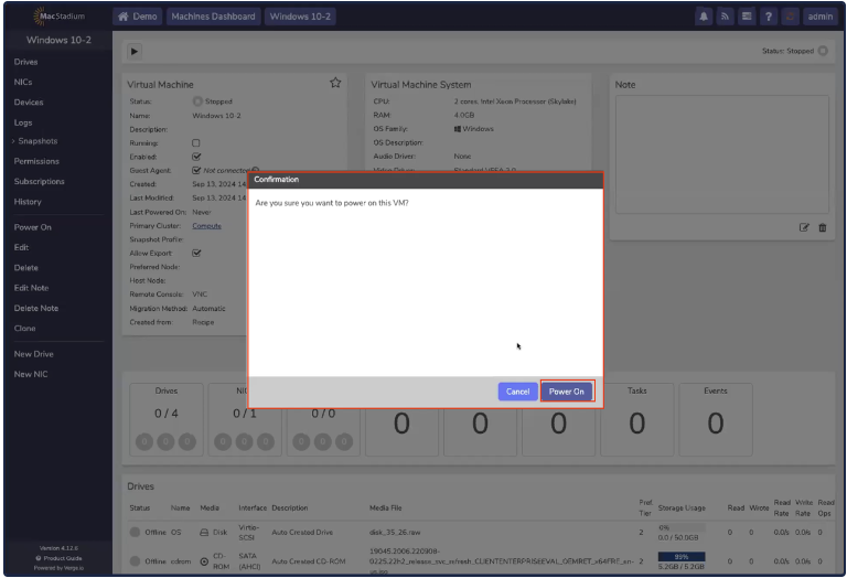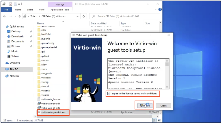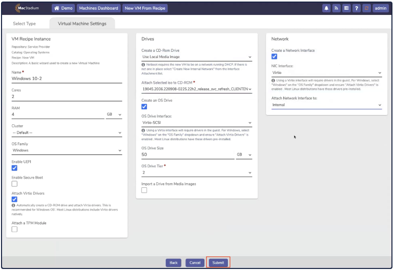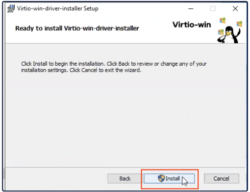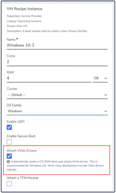 VM Recipe InstanceMake sure the Attach Virtio Drivers checkbox is selected. This is required to install the Windows operating system.A Windows Install ISO must be uploaded to Media Images before installation.6. In the Drives box, make sure the Create CD-ROM Drive is set to Use Local Media Image. Select an uploaded Windows install ISO.Drives7. In the Network box, set the NIC Interface to Virtio , and the Attach Network Interface to Internal.Network8. Click Submit.Virtual Machine Settings9. In the New VM (Windows) page, click Power.10. In the Confirmation box, click Power On.Power On11. Open theConsole by clicking the Console button.Console Button12. When prompted, press any key to begin installation.13. The Windows screen opens, click Next.Windows14. ClickInstall Now.Install Now15. Accept the license terms and click Next.Advanced16. Select Custom: Install Windows Only (advanced).Custom17. The installation will fail to find any drives. At this point, the virtio storage drivers need to be loaded to continue the install. Click Load Driver.Load Driver18. Click OK.OK19. Select the driver for the corresponding Windows version, according to the folder name. For example, the Windows 10 driver is located in E:\amd64\w10\.Windows 10 Driver20. Windows begins to install. Allow the installation to finish. Network connectivity does not work during the install, this is expected, as Windows does not come with Virtio network drivers.Installing Windows21. Once installed, additional drivers need to be installed to allow network connectivity. To do this, open Explorer, and navigate to This PC. A CD drive with Virtio drivers should be accessible.CD22. Double click on virtio-win-gt-x64.File Name23. When the Setup Wizard opens, click Next.Wizard24. Accept the terms and click Next.Terms25. Choose all and clickNext.Select All26. ClickInstall to begin the installation.Install27. The progress bar appears.Progress Bar28. Click Finish to complete the Setup Wizard.Finish29. Install Guest tools by clicking on the file virtio-win-guest-tools. Then accept the license terms and click Install.Install30. The progress bar appears.Progress Bar31. Click Close to complete the installation. Windows is now ready for use.Close