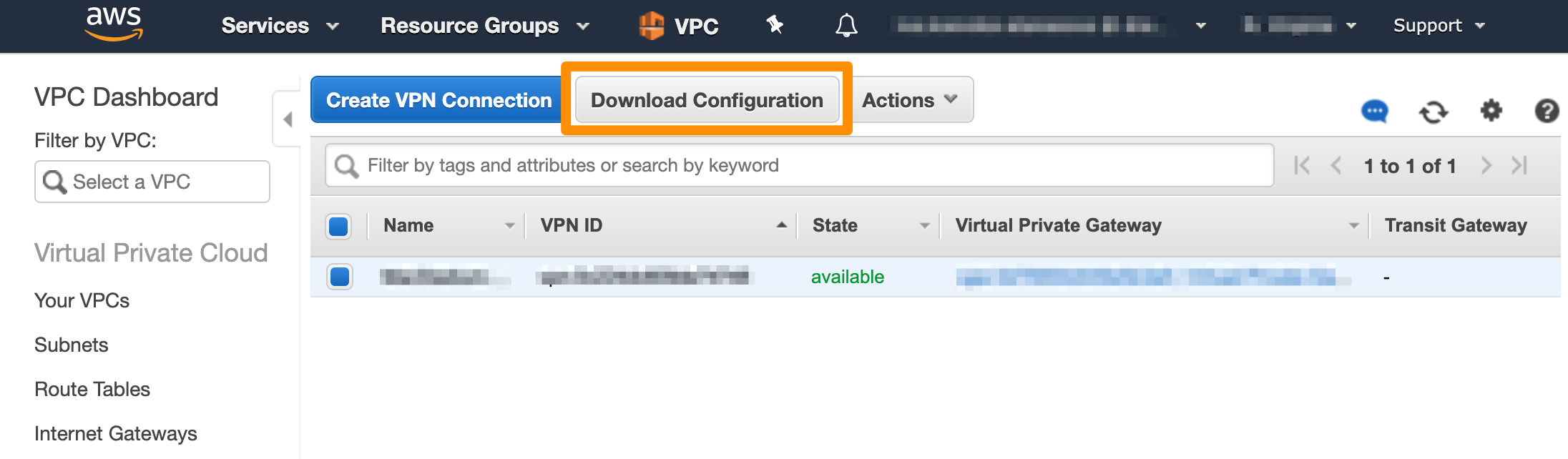 - In the list, select your newly created VPN connection and click Download Configuration.