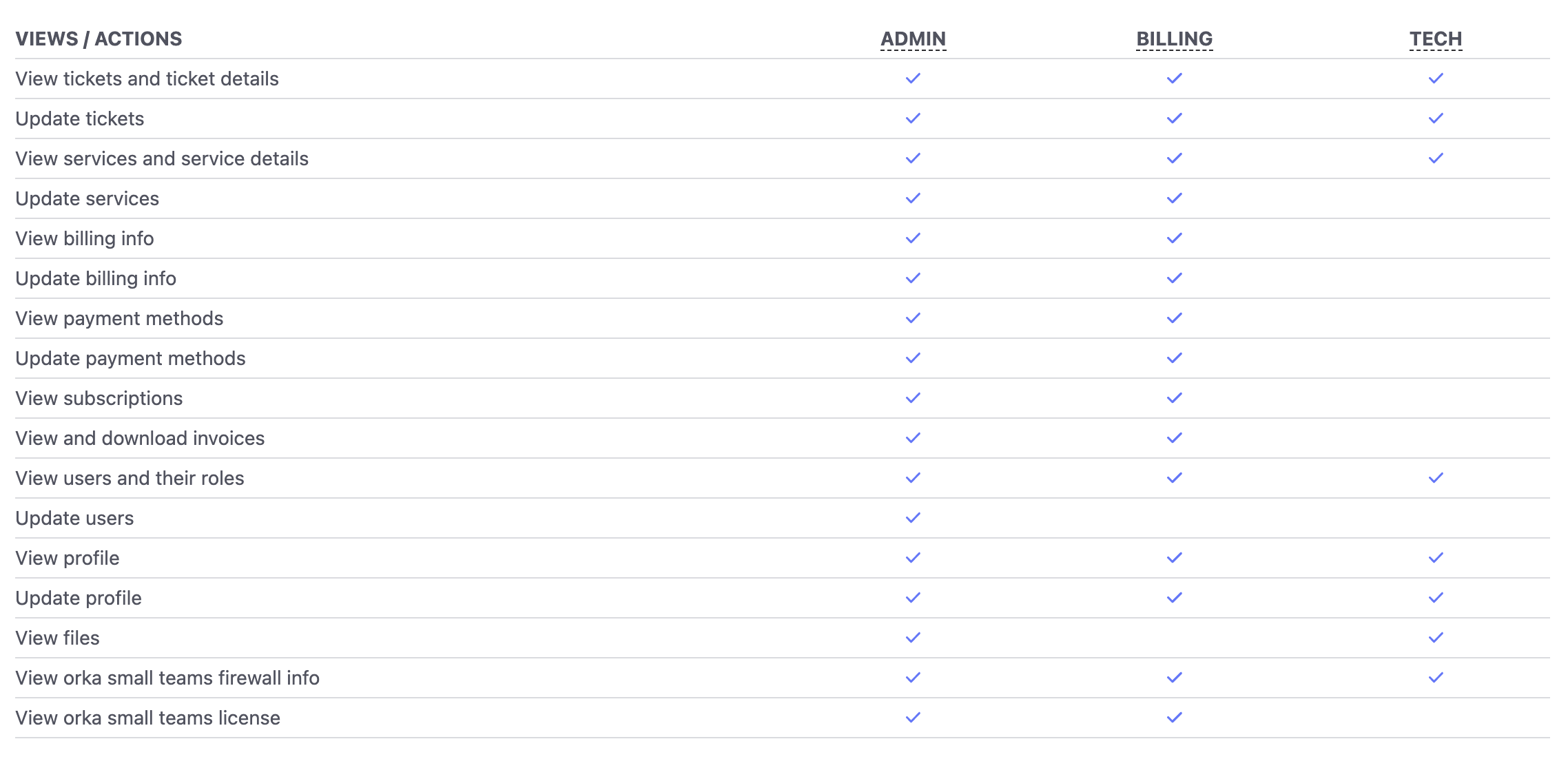 The Admin account role maps to the Administrator group role in the Orka cluster. The Tech account role maps to the Technical group role in the Orka cluster. The Billing account role does not map to any role in the Orka cluster. Cluster service accounts don’t map to any account roles. Within the Customer Portal, the Admin, Tech, and Billing roles have the following capabilities:(Orka Small