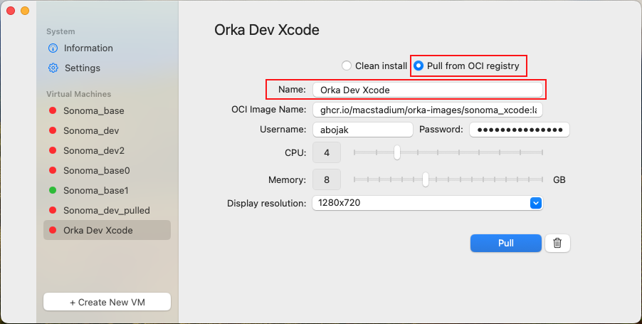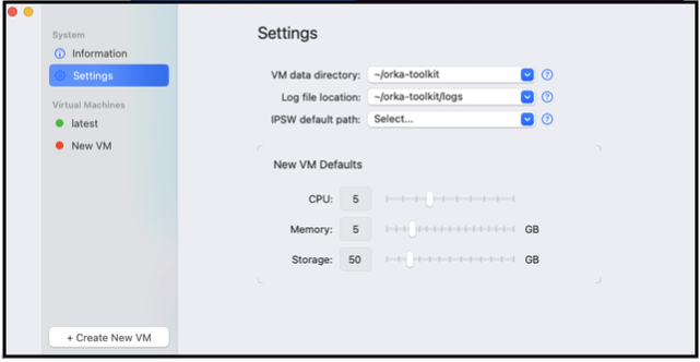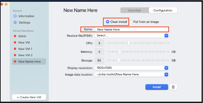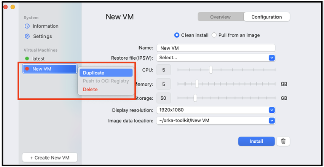 Orka Desktop has a clear and intuitive GUI, which makes it easy transition to using Orka in the cloud. It provides information about your system, available images, and VMs. 1. Download Orka Desktop. Move to your Applications folder. Run Orka Desktop. 2. Create a New Virtual Machine (VM). There are two options for creating a new VM:- Clean Install , where the image is created from an existing IPSW file.