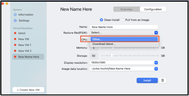 ** - When the new Virtual Machine dialog box opens, select Clean Install(based on an IPSW); then use the Name field to name the VM.