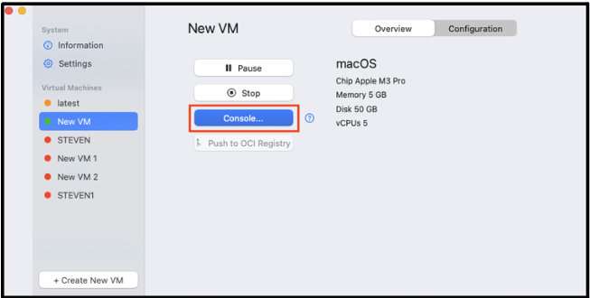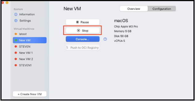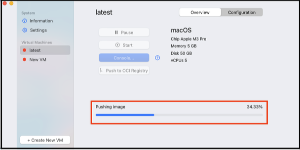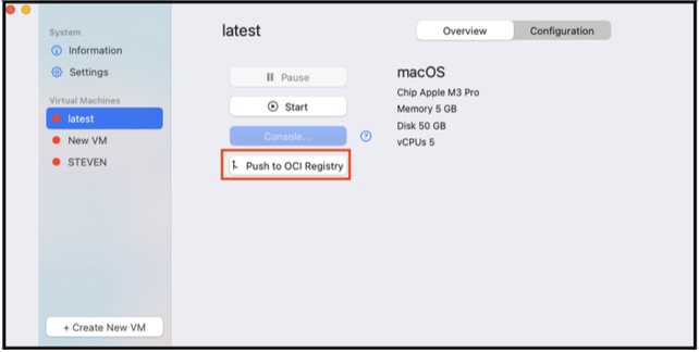 Users can push the image to an OCI registry. Push allows users to push an image, so another user can download and use that image. This is helpful for sharing an image across a team; for example, an IT Admin can create and configure an image and push it to a shared location, then team members can access that image and begin using it. Developers may also push an image to a shared registry for testing purposes.- Select an existing VM.