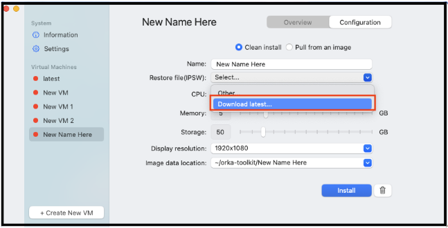 - If a user does not have a local IPSW file to use for the new VM, then select Download Latest, to get the latest files from Apple.