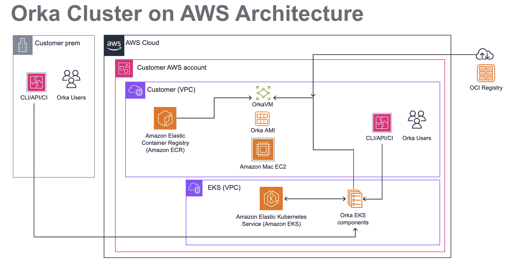 - Customer’s AWS Account, which houses all the AWS Cloud components for the Customer. The Orka Cluster is software that is installed into various AWS Cloud components, like EKS, EC2 Mac, and ECR.