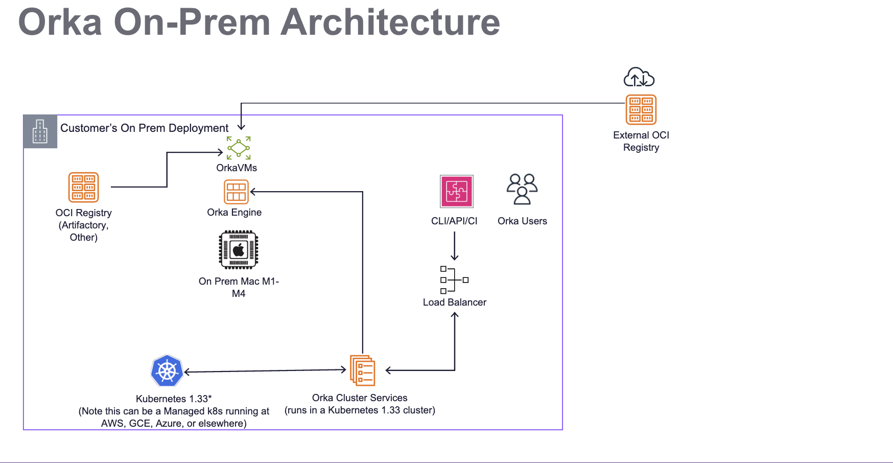 - A dedicated Kubernetes 1.33 cluster, which runs Orka Cluster Services for orchestration and automation.