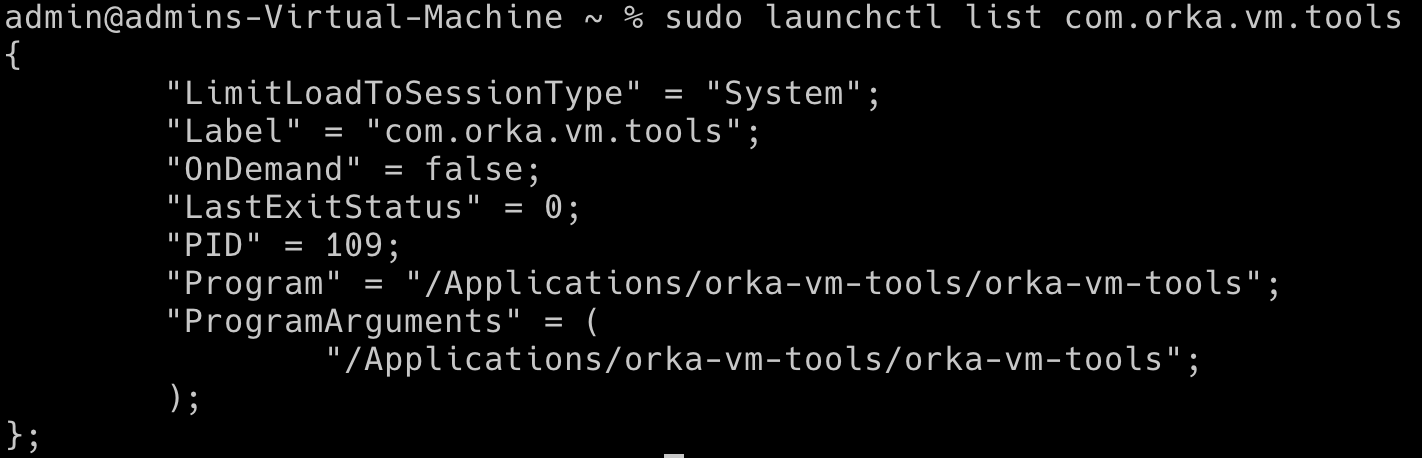 IMPORTANTMake sure to pull the updated sonoma-90gb-orka3-arm image from the remote in order to use Orka VM Tools on your virtual machines and benefit from the new Orka features. Installing Orka VM tools to your VMs as a standalone installation is available with Orka 2.2.0+.Learn more about pulling an imageTo access the latest features and updates, always run the Orka VM Tools version that matches your cluster and the other Orka tools and integrations you’re using. For example: your cluster, Orka tools and integrations, and Orka VM Tools all run 3.x versions.Orka VM Tools run in the background. They are started automatically as a daemon when the operating system starts. You can control Orka VM Tools process using the following commands:Run sudo launchctl list com.orka.vm.tools to see if Orka VM Tools are running in your VM.